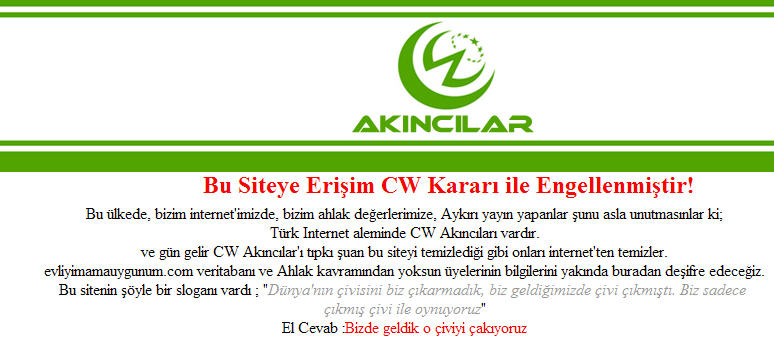 Oluşumunun Türkiye ‘de Geçtiğimiz Aylarda Açılan Sitesi EvliyimAmaUygunum.com sitesi Cyber-Warrior TIM Akıncılar Tarafından Hacklendi! |